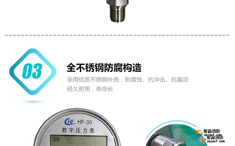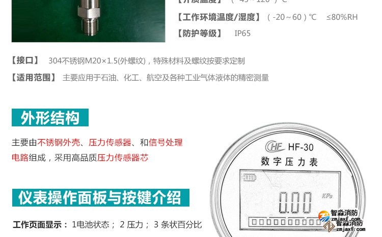 數字壓力表量程0-20MPa,精度0.4級測試消火栓用30. 細水霧末端試水裝置壓力表量程:0MPa~0.6MPa;精度:0.4級安裝在系統管網或分區管網的末端,檢驗系統啟動。